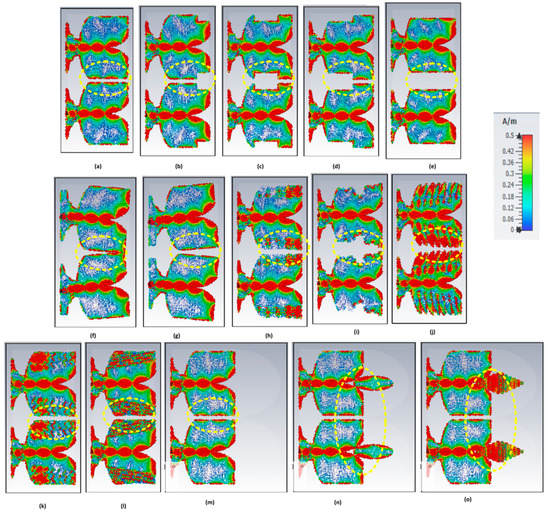 Surface current performance of (a) Regular Palm Tree (RPT-CVA), (b) Front Cut Palm Tree (FCPT-CVA), (c) Middle Cut Palm Tree (MCPT-CVA), (d) Back Cut Palm Tree (BCPT-CVA), (e) Complete Cut Palm Tree (CCPT-CVA), (f) Left Tilt Palm Tree (LTPT-CVA), (g) Right Tilt Palm Tree (RTPT-CVA), (h) Hilbert Fractal Structure Palm Tree (HFSPT-CVA), (i) Koch Fractal Structure Palm Tree (KFSPT-CVA), (j) Exponential Slot Edge Palm Tree (ESEPT-CVA), (k) Vertical Wave Structure Palm Tree (VWSPT-CVA), (l) Horizontale Wave Structure Palm Tree (HWSPT-CVA), (m) Regular Lens Palm Tree (RLPT-CVA), (n) Elips Lens Palm Tree (ELPT-CVA), and (o) Metamaterial Lens Palm Tree (MLPT-CVA).
