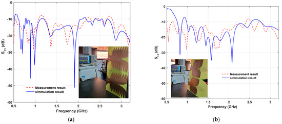 Figure 14 depicts the fabrication and comparison of measurement and simulation results for ESEPT-CVA and MLPT-CVA. At 4 GHz, both antennas have a greater gain than the RPT-CVA, as seen in Figure 7. Antenna measurements are carried out by taking S11 antenna data using a brand VNA Siglent which works from a frequency of 100 kHz to 3.2 GHz. From the measurement results, it is found that the S11 antenna measured by VNA produces better results at low frequencies. It is known that the measurement results are in agreement with the simulation results where most of the antennas have S11 below −10 dB. High-gain antennas can be applied to radar applications.