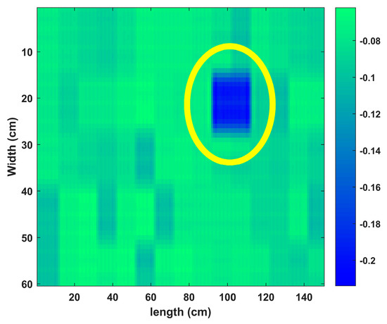 The detected wall has an area of 60 × 150 cm2 by dividing the area into several segments area in the x and y direction. The S21 data received on the laptop will be processed and a signal reconstruction process will be carried out so that object detection results are produced as shown in Figure 16. The yellow circle shows the position of the detected target in the x-y plane.