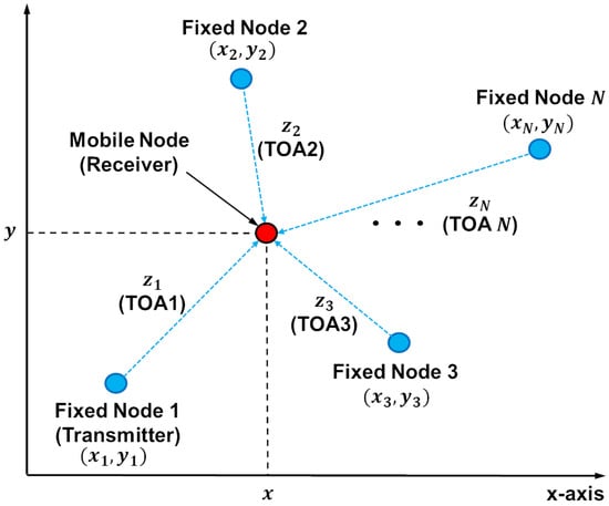 where is the TOA obtained from the i-th fixed node (), c is the speed of light; is the distance between the mobile node and the i-th fixed node, and is the 2D coordinate of the i-th fixed node. v is a zero-mean white Gaussian measurement noise with the variance .
