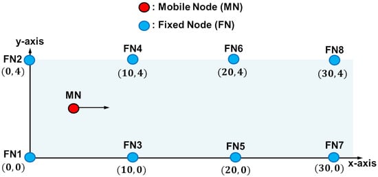 In recent years, indoor localization systems based on wireless sensor network (WSN) technologies [,] have been widely used for various industrial applications, such as tracking workers and vehicles in factories, hospitals, and construction sites [,,,,,]. Indoor localization systems comprise sensors that communicate with one another through wireless signals. Some of these sensors are attached to the humans or vehicles that need to be tracked and called mobile nodes, while other sensors are installed at fixed positions in an indoor space and called fixed nodes. The wireless signal transmission between mobile and fixed nodes can be quantified by measurements such as the received signal strength (RSS) [], time of arrival (TOA) [], and time difference of arrival (TDOA) []. These measurements can then be processed using localization algorithms to obtain the position of mobile nodes.