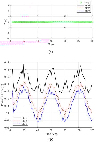 We simulated EKF-based localization based on Algorithm 1 with three different numbers of NN measurements , 5, and 8. Figure 3 shows the localization simulation results for the long corridor scenario under the LOS condition. In this figure, EKF3 and EKF5 denote EKFs based on three and five NN measurements, respectively. EKF8 denotes an EKF that uses all eight measurements and is hence not the proposed NN measurement-based algorithm but a conventional algorithm. In Figure 3a, the trajectories from all the three algorithms are indistinguishable because their differences are insignificant. The RMS position errors in this simulation are shown in Figure 3b. We can see that the error decreased when a greater number of measurements was used. However, the differences are insignificant (≤3 cm).