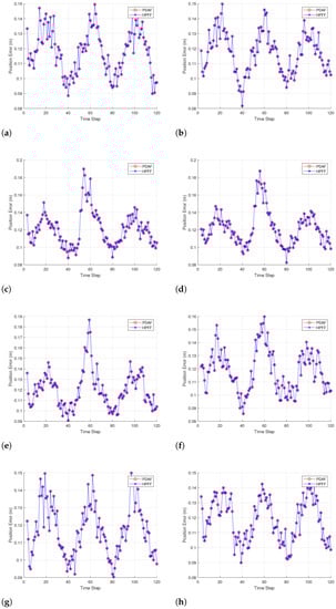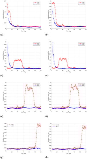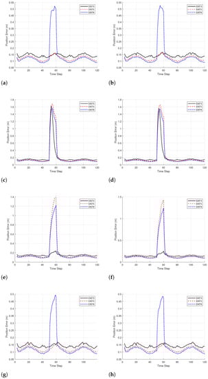 RMS position errors of EKF-based localization under temporary NLOS conditions in which the transmitter (FN) in a NLOS was (a) FN1, (b) FN2, (c) FN3, (d) FN4, (e) FN5, (f) FN6, (g) FN7, and (h) FN8.