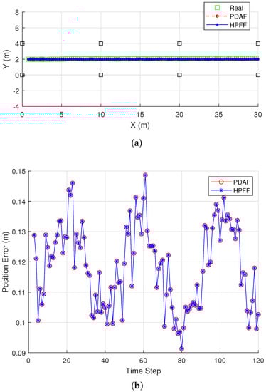 We now evaluate PDAF- and HPFF-based localization in the long corridor scenario by simulating Algorithms 2 and 4 under LOS and NLOS conditions. Figure 5 shows the localization results for the LOS scenario. The HPFF results are identical to the PDAF results. This is because the main filter in the HPFF did not fail and the assisting filter did not operate. Thus, HPFF performed similarly to pure PDAF.