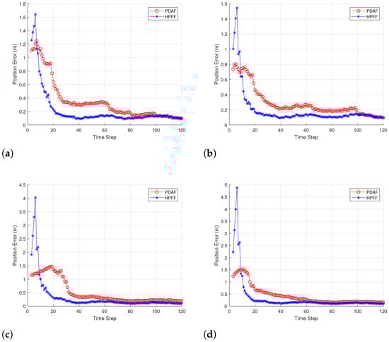 The measurement and process noise variances were set as and , respectively. The sampling interval T was set to 0.5 s. The design parameters for the PDA filter were set as follows: The detection probability was set to , the gate probability to , and the gate threshold to . The horizon size of EMVF filter was set to . The numbers of measurements used for HPFF were set as and .