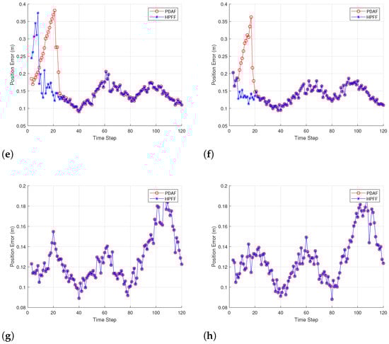 We tested PDAF and HPFF under more severe conditions. We assumed that one of the FNs was constantly in the NLOS condition over the entire simulated time. Figure 7 shows the localization results obtained under this scenario. PDAF exhibited degraded performance and larger errors compared with those of HPFF in six cases (Figure 7a–f). When FNs 7 and 8 were in NLOS (Figure 7g,h), the PDAF used the measurements from FNs 1–6, which are closer to the mobile node than FNs 7 and 8. Thus, PDAF could successfully work for most of simulation time. In the constant NLOS conditions, PDAF with NN measurements cannot avoid using the NLOS-contaminated measurements. PDAF unequally used the measurements by imposing association probabilities on them. Thus, PDAF exhibited much better accuracy than the EKFs. However, if there was no surviving measurement after validation process in PDAF algorithm, the PDAF skipped the measurement update process. This situation occurred due to the constant NLOS conditions and led to degradation of PDAF’s estimation accuracy. On the contrary, HPFF can use the assisting EMVF filter in the same situation. EMVF filter is not very accurate but is robust against various types of errors and can provide state estimates under such severe conditions. When the main PDAF algorithm failed due to lack of surviving measurements, the HPFF algorithm operated the assisting EMVF filter. State estimates produced by the EMVF filter become the output of HPFF and were used to reset the main PDAF. In Figure 7a–d, although the initial errors of HPFF were larger than those of PDAF, the HPFF error decreased rapidly. In the cases in which FN7 and FN8 were in a constant NLOS condition, localization using PDAF was successful and HPFF performed identically to pure PDAF.