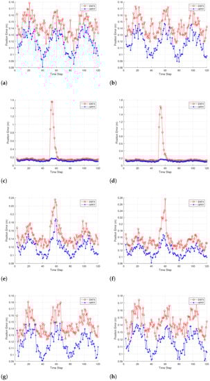 where b is the NLOS error, and we assume that it is a Gaussian noise with the mean and variance, and , respectively. is not zero and that the NLOS error is generally much larger than the zero-mean measurement noise v. We set the NLOS error parameters to and .