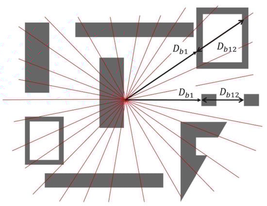 Without describing all the details included in [], the cumulative distribution functions (CDFs) are calculated for a number of survey points representative of the expected base station locations within the area (e.g., along the street central lines, the curb lines, the edges of pavements/sidewalks) on building façades (although the statistics do not change if the base station is on the building roof). As shown in Figure 1, from each of these points, for all horizontal radials at 10-degree intervals, the roof height at which the radial intersects the building façade (without considering any parts of the roof higher than this point) is recorded, as well as the horizontal distances to the first and second buildings. The second building may be part of the first: the key point in identifying it is that the ray travels over un-built-on ground before reaching it. The distance from the survey point to either the first or the second building is limited to 1000 m: if no building is met on the radial by such a distance, the first and second building distances are set to 500 m, and the building heights are set to 0 m. In this way, following the other criteria defined in [], it is possible to build statistics of the building height and distance from the survey points, which can be achieved by resorting to any survey method: direct surveying, 3D models derived either from LIDAR or stereo photography, large-scale digital maps with building heights.