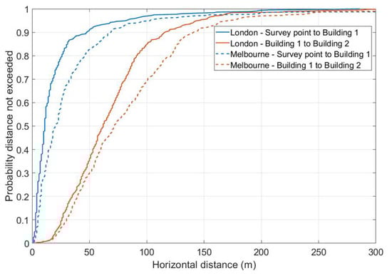 CDFs of the building distance (Db1 and Db12) for London and Melbourne, extracted from [].