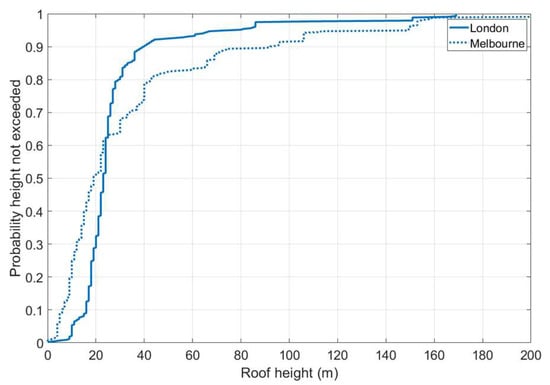 In fact, the building height and distance statistics are gathered according to Report ITU-R P.2402 [], which also includes the results obtained for two sample cities, namely, Melbourne (Australia) and London (United Kingdom).