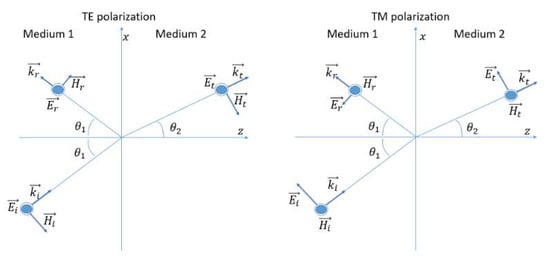 Referring to Figure 4, let us consider a plane wave impinging on the discontinuity between two homogeneous and isotropic media with different electromagnetic properties (electric permittivity ε, magnetic permeability µ and conductivity σ). The electric () and magnetic () fields of the incident wave are identified by the subscript i, while those corresponding to the transmitted (refracted) and reflected waves are identified by subscripts t and r, respectively. Finally, represents the propagation vectors, all lying on the same (x, z) plane. The reflection and transmission mechanisms differ for the two orthogonal polarizations of the incident waves, i.e., the transverse electric (TE) component, for which is perpendicular to the (x, z) plane, and the transverse magnetic (TM) component, for which lies on the (x, z) plane.