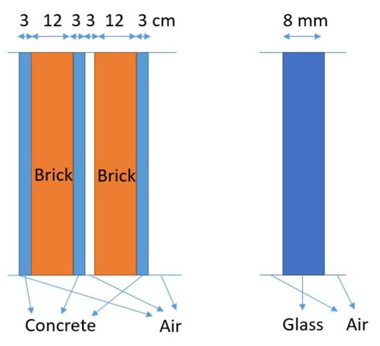 Structure of the interfaces considered for building reflections: concrete/brick walls (on the left) and single glass slab (on the right).