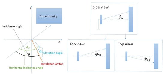 As is clear from (1) and (2), the reflection coefficients are a function of the incidence angle, which, in turn, depends on the horizontal and vertical angles defined in Figure 6 (right side, depicting two examples of different horizontal angles). The left side of Figure 6 depicts the incidence geometry for two sample rays having the same elevation angle and different horizontal angles . Referring to the left side of Figure 6, where the building façade is parallel to the (x, z) plane, the incidence angle is given by