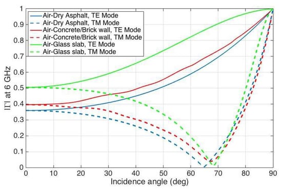 Figure 7 depicts the trend of the absolute value of the reflection coefficients at 6 GHz, for both TM and TE polarizations, as a function of the incidence angle. Results are shown for reflection from buildings (air–concrete/brick wall and air–glass slab) and from the ground (air–dry asphalt). Overall, the TM component undergoes a lower reflection when compared to the TE polarization, especially around Brewster’s angle, for which the TM wave is (almost) totally transmitted [].