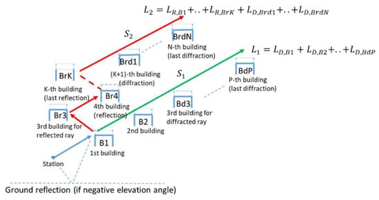 In the presence of reflections from buildings and/or the ground (NLoS─Non-Line-of-Sight case), the clutter loss calculation depends on the specific scenario; an example is shown in Figure 10. A key aspect is that two paths are considered whenever the ray hits either the first or second building. The first path is associated with the portion of the wave overcoming the first (or second) building (path S1, with total loss L1), which will be affected only by further diffraction (possibly) from other buildings, until building dP (with the diffraction loss of building d(P + 1) being equal to zero). The second path is associated with the reflected wave (path S2, with total loss L2), which will be (possibly) further reflected by other obstacles along its path to the satellite. In the latter case, L2 is calculated by summing (in dB) all the reflection losses and the diffraction losses given by the further overcome buildings, after the last reflection, until building rdN (with the diffraction loss of building rd(N + 1) being equal to zero). This is clarified in Figure 10, which shows an example of how L1 and L2 are calculated.