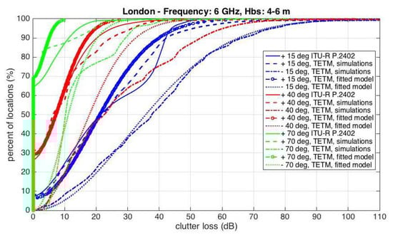 A simple analytical model, dependent on the frequency and elevation angle, is definitely more easily applicable than the complete simulation outlined in Section 2. For this reason, the clutter loss statistics calculated by simulating the London, Melbourne and Milan scenarios were fitted by a mathematical expression that accurately approximates the statistics for low clutter loss values and time percentages (typically lower than 60–70%), i.e., the most important ones for interference applications. The resulting fitting parameters are not associated with a single city, but they are related to the local statistics of buildings’ height and the base station’s height, besides the elevation angle and frequency.