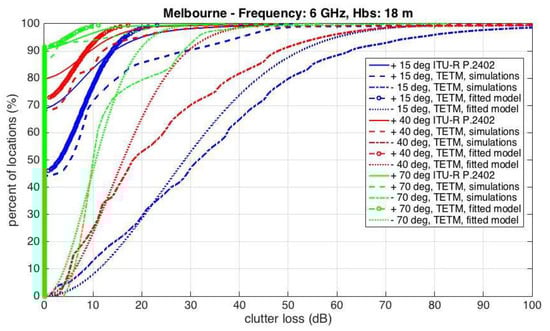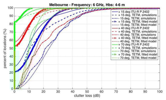 Figure 11, Figure 12, Figure 13 and Figure 14 show that the statistics from the proposed Monte Carlo simulation provide similar or larger clutter loss values if compared to the results obtained by the report ITU R P.2402 model, for elevation angles of +15° and +40°. The proposed Monte Carlo simulation yields lower values than the ITU-R approach in the low probability range, for the 70° elevation angle. These observations are even more evident for the antenna height of 18 m and for Melbourne, which is characterized by taller and more distant buildings (see Figure 2 and Figure 3). The reason behind the differences in the results highlighted above is likely due to the fact that, in the proposed Monte Carlo simulation, more realistic reflections coefficients are used, as well as an unlimited number of wave reflections and diffractions. As expected, for negative elevation angles, the clutter loss values are much larger; however, concerning frequency interference studies, this result is compensated by the usual larger power radiated by the base station towards the users on the ground. As expected, the analytical model described in Section 5.2 is close to the simulations results especially in the low probability range which is the most important for interference studies.