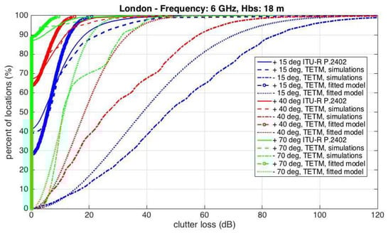 As it is not possible to test the model against the few measurements available in the literature (as mentioned in Section 5.1, this is due to the lack of measurements with directive antenna receivers), the predictions of the analytical model, described in Section 5.2, are compared to the simulation results. Melbourne and London, considered in Report ITU-R P.2402, present different planimetric characteristics, both in terms of building height and distance. The clutter loss calculation methodology presented in Section 2, Section 3 and Section 4.1 is applied by simulating rays with TE polarization and rays with TM polarization, at 6 GHz. Asphalt is considered to model the ground, while, as for buildings, the probability of concrete/brick and glass walls is assumed to be equal to 90% and 10%, respectively. The results achieved with a uniform random horizontal incidence angle between 0° and 60° are presented in Figure 11 and Figure 12, respectively, for London and Melbourne, with the height of the base station uniformly distributed between 4 and 6 m. A horizontal incident angle between 0° and 60° has been chosen according to the steering capabilities of the transmitting antenna. In fact, in a three sectoral antenna, the allowed horizontal steering directions are between −60° and +60°. Therefore, transmitted rays can impact on a building in front of the antenna with an incident angle between 0° and 60°. Figure 13 and Figure 14 present the results obtained by fixing the base station height at 18 m in London and Melbourne. In each figure, the statistics from the Monte Carlo simulation presented in Section 5.1 are compared to the analytical model illustrated in Section 5.2, as well as the results obtained by simulations of Report ITU-R P.2402.