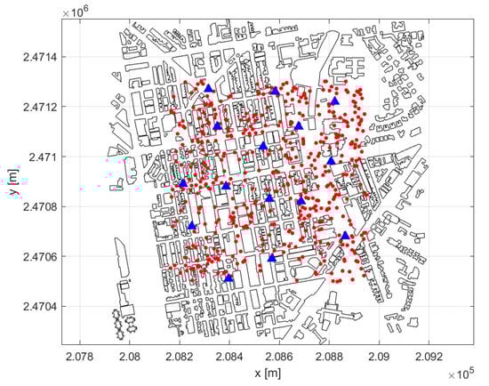 Survey points (red dots) and BSs (blue triangles) simulated with the ray tracer.