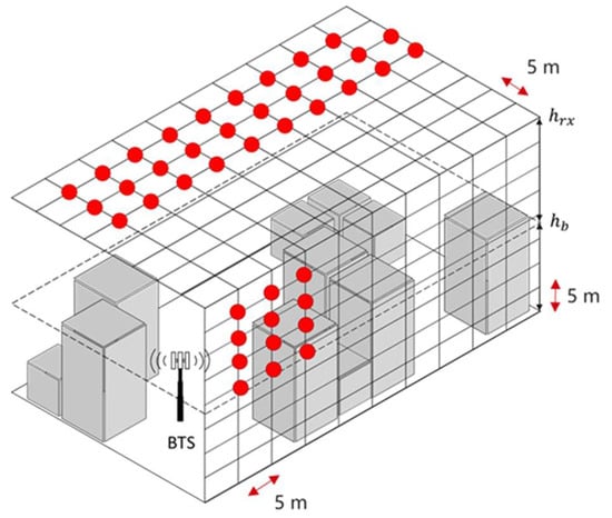 The commercial ray tracer SIRADEL© [] is used to validate the proposed model. The chosen urban environment for validation is a square area with a lateral dimension of 1.2 km in the city of Hong Kong, which is deemed appropriate due to the high building density and the scarcity of vegetation. The statistics of buildings are obtained as detailed in Section 3 from the available SIRADEL© data by deploying 500 survey points. CDF curves of the clutter loss are obtained through ray tracing by deploying 15 antennas across the map, within the same region, as the survey points (see Figure 15), to serve as transmitting base stations, while a box of receivers is placed all around the map to collect outgoing rays (see Figure 16). Transmitting antennas are assumed to be omnidirectional, with a transmission power (total radiated power, TRP) of 60 dBm and a height of 18 m from the ground. The wave polarization is vertical. The box of receivers consists of a grid for each side, with receivers spaced 5 m along x, y and z. In this context, a “point receiver” is considered (without a physical dimensions), which collects the information of all rays reaching it: amplitude, delay, departing direction, arrival direction, etc. The box is designed to enclose all buildings, so the last grid point should be at a height , where is the maximum height of the buildings.