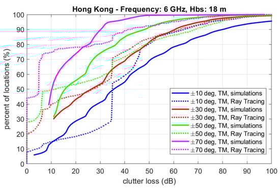 This is not possible with the traditional ray-tracing approach using isotropic receivers [], for which all the radiated rays are combined at the receiver and the one affected by the lowest loss dominates; in this case, the range of possible clutter loss values is therefore limited. Measurements are expected to provide results closer to the ray-tracing approaches, as they typically use omnidirectional receivers on the ground (and directive transmitting antennas installed on a building), and therefore the total received power is also inherently calculated by combining all rays [,]. In fact, ray-tracing simulations and measurements sufficiently represent the behavior of conventional wireless systems, using static antenna radiation patterns, but not that of 5G systems, whose adaptive antennas (beam forming) radiate towards different single users in each instant.