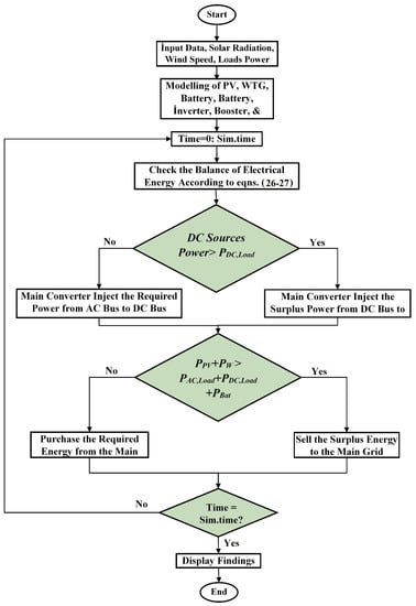 The MG is capable of operating in two modes of operation. The primary converter’s function in grid-tied mode is to maintain stable voltage on the DC bus and to swap power between the AC bus and DC bus. The boost converter is controlled to deliver the maximum amount of power possible from solar PV. When the output power of the DC sources exceeds the input power of the DC loads, the power converter represents an inverter, injecting power from the DC bus to the AC side and vice versa. When the total power generation in the hybrid grid exceeds the total load, the utility grid obtains more power. Otherwise, the hybrid grid will be supplied with electricity by the utility grid. Figure 2 illustrates the system’s operating strategy.