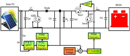 To maintain the hybrid MG running smoothly under different supply and demand scenarios, a coordination control algorithm is proposed for boost and main converters. This algorithm derives from the fundamental control algorithms of the grid-interactive inverter. The booster circuit’s control block diagram is shown in Figure 3. The basic P and O algorithm takes into account solar irradiance and temperature to establish a reference value for the terminal voltage used by solar panels [51,52]. The PV system makes use of this control scheme so that the MPPT algorithm can maintain the optimum terminal voltage at the solar panels. The voltage loop based on the PI controller with proportional gain = 2 and integral gain = 0.2 is capable of ensuring tracking of the voltage reference with a zero error in steady state.