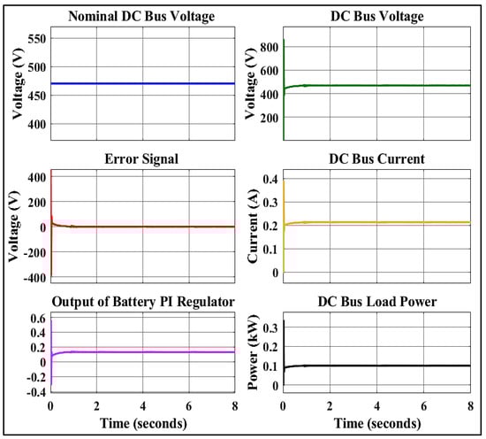 The battery’s energy constraints are determined by its limits, which are calculated as SOCmin < SOC ≤ SOCmax. It should be noted that while cannot be directly measured, it can be estimated using some of the methods described in [53,54]. The charging and discharging rates are constrained by . In the absence of the main grid, for cases of an idle battery or maximum power injection into the battery, either the PV system, the WTG, or both must operate in the off-MPPT mode; otherwise, either the PV system or the WTG must operate in the on-MPPT mode. For various situations, the battery buck-boost converter may operate in the discharging, charging, or idle mode by adopting the PI controller with proportional gain = 2 and integral gain = 0.2, as shown in Figure 3. If is negative, the inverter mode operation is the mode of operation of the main converter; if is positive, the converter mode operation is the operation mode of the main converter. When the battery has a low SOC and the electricity supply is lower than the demand, load shedding is required to keep the power grid stable.