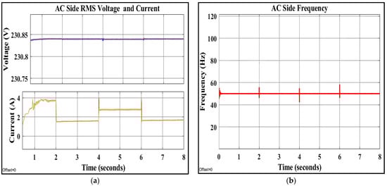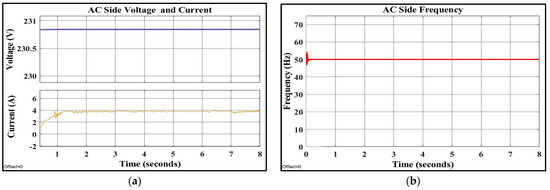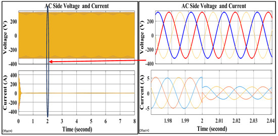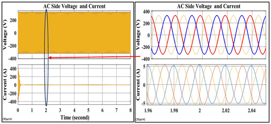 The hybrid MG employs distinct types of power converters. It is necessary to coordinate these converters with the utility grid in order to provide high-efficiency, uninterrupted, and high-quality power to the AC and DC loads. The boost converter’s control objective is to maintain the MPPT of the photovoltaic array by controlling its terminal voltage. The DFIG’s back-to-back AC/DC/AC converter has been controlled to obtain available power and synchronize with the AC grid. The hybrid grid’s excess energy can be sold to the utility grid. The battery’s primary purpose is to prevent frequent power transfer between both the DC and AC links. Using the technique in [46], the battery’s converter can be used as an energy buffer. The main converter is bidirectional in operation to take advantage of the complementary characteristics of wind and solar energy [47,48]. The main converter’s control objectives are to maintain a constant DC-link voltage for a DC load and to maintain synchronization with the utility system and the AC link.