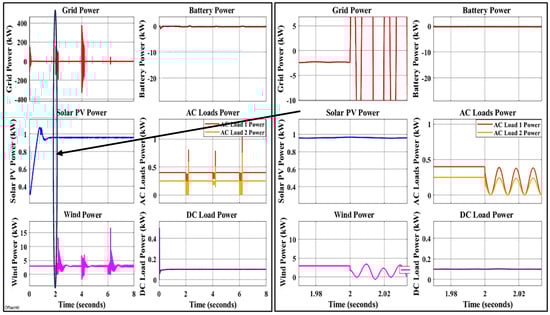 When operating in grid-tied mode, the battery converter is not as crucial because the power grid handles load balancing. The battery is critical in autonomous mode for power balance and voltage stability. The energy management system (EMS) regulates various converters by assigning control objectives. Boost and battery converters are used in stabilizing the DC bus voltage under various operating conditions. The main converter is controlled by two digital PR current controllers in a synchronous reference frame to ensure the stability and quality of the AC bus voltage. Solar PV systems can operate in MPPT or off-MPPT modes depending on the system’s operational requirements. The wind turbine and PV panel are subjected to wind speeds and solar irradiance, respectively, to predict the power variation of AC and DC resources and to validate the MPPT control algorithm.