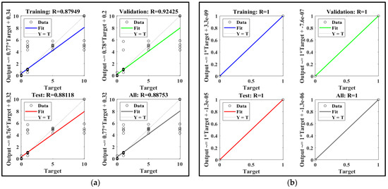 Figure 25 depicts a regression analysis with validation, training, and test data for fault detection and classification in (a) and the fault’s location in (b). The dashed line represents the ideal line on which the targets and outputs are equal. Points of data are depicted by the circles while the colored line indicates the best outputs-to-targets fit. The circles congregate across the dashed line, indicating that the outputs are relatively close to the targets. As a result of these findings, it can be concluded that the ANN structure is adequate for fault prediction. Figure 25b shows that the colored line is exactly on the dashed line, indicating that there is no error and that the output is equal to the target data.