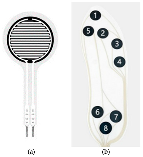 Film pressure sensor and insole configuration. (a) Thin-film pressure sensor MD30-60; (b) insole sensor configuration (the number 1-8 is the sensor arrangement number).