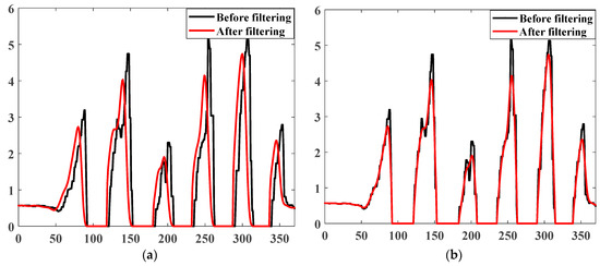 Comparison of filtering effect of AD8 channel of plantar pressure sensor. (a) Traditional moving average filtering; (b) improved sliding mean filtering.