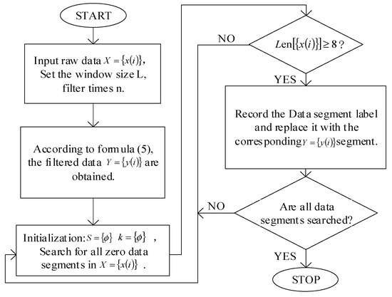 | 1. for all do; 2. Formula (5) is obtained 3. ; times filtered data; 4. end for 5. Initialization , ; 6. Search for all zero data segments in ; 7. while ; 8. Set ; 9. Set ; 10. for all do; 11. 12. 13. end for 14. end while |