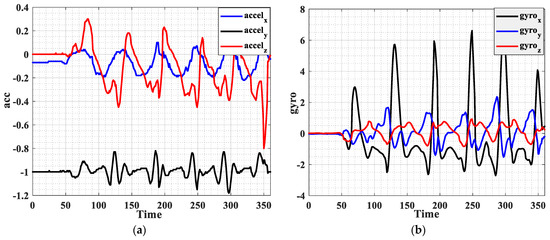 Figure 7 shows the walking inertial measurement unit (IMU) data of the right heel of a test object. Figure 7a shows the information of three-axis acceleration. It can be seen that the acceleration variation characteristics of the x-axis and z-axis are obvious, while the curve characteristics of the y-axis are not obvious, so auxiliary feature processing can be performed. At the same time, Figure 7b shows the information of the three-axis angular velocity. It can be seen that the angular velocity variation characteristics on the x-axis are more obvious, while the characteristics on the y and z-axis are not obvious. To add some information with obvious characteristics, resultant acceleration and resultant angular velocity are calculated separately: