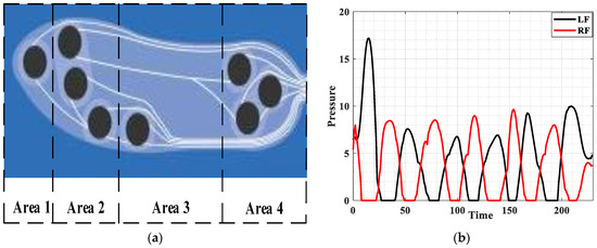 It is necessary to partition the plantar pressure information before extracting features to reduce the difficulty of data information processing. As shown in Figure 8a, the plantar is divided into four stress areas (toe, forefoot, arch, and heel), and then the data of each stress point in the stress area are summed up and the average value is taken as the stress size of the area.