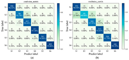 The sensing information of the recognition framework in this paper comes from the multi-source fusion of plantar pressure, accelerometer, and gyroscope information. This section demonstrates that the recognition performance of multi-source fusion information is better than that of single-sensor information. Table 2 shows the gait recognition results using plantar pressure, accelerometer, gyroscope information, and multi-source information fusion, respectively. The overall accuracy of multi-source information fusion can reach 94.7%, while the recognition accuracy of plantar pressure, accelerometer, gyroscope information, and single IMU information is 86.6%, 83.9%, 82.4%, and 87.3%, respectively. It is much lower than the gait recognition result after multi-source information fusion. In addition, the accuracy of gait sub-phase recognition after multi-source information fusion is also much higher than that of single-channel sensor information. Therefore, the recognition performance of multi-source information fusion is better than that of single-sensor information.