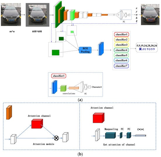As can be seen from the top half of Figure 2a, the network consists of two steps, extracting the features and predicting the LP position. After an extensive literature review [,,,,,,,] and considerable testing, we improved the VGG16 architecture, and proposed the LP extracted features module with the attention module. The attention module helps to provide more accurate detection. The channel attention mechanism provides more grained refined features and emphasizes “what” is a semantic part from a given input []. Then, the three sibling fully connected (FC) layers are used to extract features and predict the parallelogram bounding box.