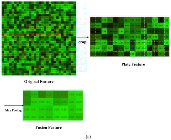 First, these equations are applied to the feature maps of the second, fourth, and seventh layers, which are cropped and the size of the feature map is (608 × w) × (608 × h) × 64, (304 × w) × (304 × h) × 64, and (152 × w) × (152 × h) × 64, respectively, where w and h are the relative lengths of the predicted width and height of the LP, respectively.