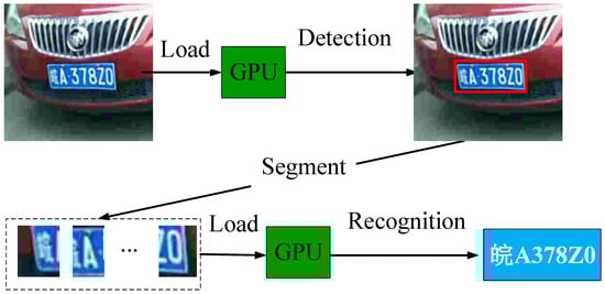 In recent years, Lubna and Naveed Mufti summarized many interesting LPDR methods []. State-of-the-art LPDR methods often consist of number plate extraction (NPE), character segmentation (CS), and character recognition (CR) (as output from the system) []. Wang et al. proposed a Chinese LP character recognition method based on a deep-CNN/recurrent neural network hybrid that extracts features without character segmentation []. Laroca et al. applied a CNN to a sliding window process to recognize Indonesian LPs [], and Du et al. introduced saliency maps to CNN-based LP recognition []. DL LP recognition methods often use two-step (i.e., detection and recognition) or three-step (i.e., detection, character segmentation, and recognition) strategies [,,,,], including SSD [,], YOLO [], FAST-RCNN [], and HC []. Nur-A-Alam et al. proposed a detection and recognition method using a convolutional neural network, which made a great contribution for the smart city []. Although the step-wise models are conceptually simple, they have some obvious shortcomings. For example, the latter step strongly depends on the speed and accuracy of the previous step. If there are any problems in the early stage, the entire algorithm may not be able to generate useful predictions. Some researchers find a new solution in removing the split step and recognizing the character directly. Then, TE2E [] and RPnet [] proposed the only end-to-end network, which removes extract feature twice. It helps to save much time and acquires high accuracy. Heshan Padmasiri et al. proposed a method for automated license plate recognition for resource-constrained environments, which inspires our study greatly [].