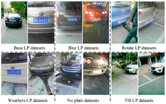 A test LP dataset was extracted from the CCPD via interpolation, including blurred, missing, weather obscured, rotated (20–50°), and vertically tilted (−10–10°) plates, as shown in Figure 4 [].