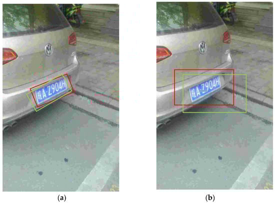 Compared with the contemporary LP detection boxes, as shown in Figure 5b, the red prediction bounding box and green ground truth bounding box are rectangular. These boxes have a large difference between the bounding box and the LP. However, the network in this study applies a more accurate deformed parallelogram, as shown in Figure 5a.