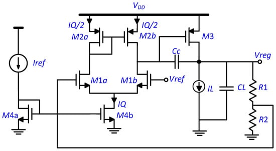 - Chen, Y.L.; Chu, G.M.; Lien, Y.C.; Lee, C.M.; Liu, C.N.J. Simultaneous optimization for low dropout regulator and its error amplifier with process variation. In Proceedings of the Technical Papers of 2014 International Symposium on VLSI Design, Automation and Test, Hsinchu, Taiwan, 28–30 April 2014; pp. 1–4. [Google Scholar] [CrossRef]