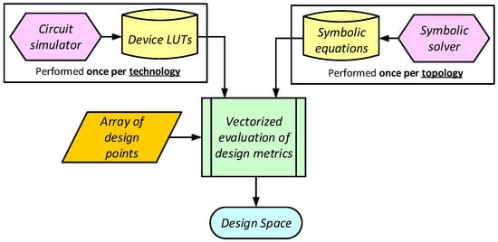 The design automation procedure main flow is shown in Figure 2. The flow uses precomputed LUTs that store the large signal and small signal behavior of the devices, in addition to automatically generated symbolic expressions of the performance metrics. An array of design points that uniformly covers the design space of interest is used. A vectorized evaluation of the design metrics is performed to compute the DC solution, in addition to the substitution in the symbolic solver equations. The flow is detailed in the following sub-sections.