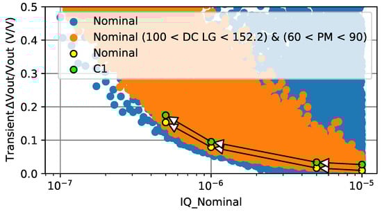 Figure 3 demonstrates the design space of the database where the axes are the quiescent current of the OTA and the transient line regulation. The blue points are all the design points, while the orange points are those that obey the constraints of and . The Pareto optimal front clearly shows the trade-off between the transient line regulation and the quiescent current. This is obvious from Equation (9); decreasing the current means a higher output resistance at the output of the OTA. This leads to a decreased value of the pole at this point, which happens to be zero in the high-frequency . As a result, degrades earlier, which causes the deterioration of the transient line regulation. In the figure, the tuned points are moved on the optimal front to minimize both the transient regulation and the current.