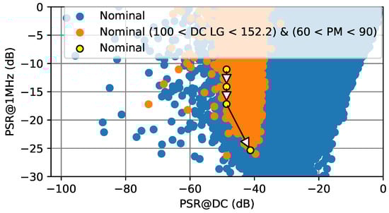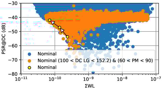 PSR@1MHz vs. PSR@DC design space for the maximum load current. The white arrows represent the movement of the chosen design point on the Pareto optimal front as different weights are assigned to each specification.