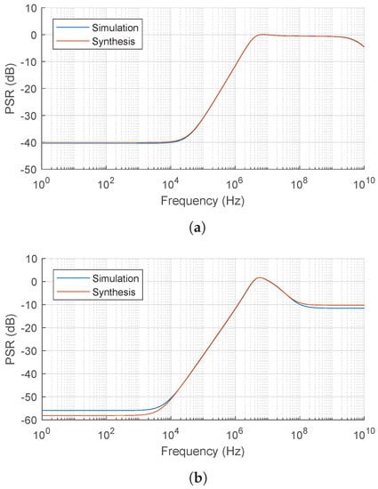 PSR is an important specification that reflects the LDO ability to shield the load from supply variations. There are two paths from which the supply noise can propagate to the output, namely, from the gate-source voltage of the pass device and through its small signal output resistance . The used amplifier topology is type A; hence, []. Since the gate of the pass device tracks its source, the propagation of the first path is neglected. The contribution of the second path can be thought of as a voltage divider between and where ; hence, the PSR can be written as