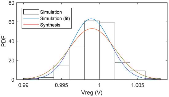 The random mismatch effect was calculated using the noise analysis transfer functions. Monte Carlo simulations were performed with Cadence Spectre using 200 runs. In Figure 8, the histogram is plotted from the simulation data, and the fit is achieved using the estimated mean and standard deviation from these data. The synthesis plot is constructed using the calculated mean and standard deviation from the mentioned procedure. Both the simulation and the synthesis results are close to each other.