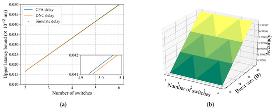 Figure 4a shows the relationship between the end-to-end delay and the number of switches for a burst size of 12 B, and it is easy to find that the CPA, DNC and simulation results show the same upward trend with the increase of switches and are relatively close to each other, which has a good fit. However, the DNC is still closer to the simulation result than the CPA, which is similar to the result of Case 1. Since we assume that the switches have the same properties and each switch has a fixed delay T, the upper bound on the delay is a simple linear summation under the (min,+) convolution operation. Figure 4b shows the variation of the accuracy with the burst size and the number of switches, we can see that the accuracy increases gradually with the increase of the burst size. This trend is consistent with that of Case 1. Moreover, the accuracy remains high as the number of switches increases, indicating that the Tactile Internet network model based on network calculus is also applicable to complex networks with multiple nodes.