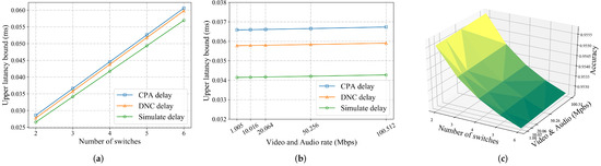 The arrival rate of the tactile feedback flow in the feedback flow is the same as that in the control flow. Combined with the result of Case 1, we set arrival rate to 1000 pkts/s, treat video and audio flow as interference flow and divide their data rates into five combinations. Because of the additivity of the arrival curve, the two kinds of interference flow can be treated equally. The CPA, DNC and simulation results for the above five cases are shown in Figure 3c. It can be seen that the trends are consistent and the upper delay bound increases with the increase of the interference flow rate. The DNC accuracy is above 95.78% and the CPA accuracy is above 95.30%. The residual service curve analysis gives the maximum residual service rate that can be obtained by the target flow by separating the service required by the interfering flow from the total service capacity. Since the worst-case end-to-end delay of the target flow is considered, the interfering flow will use the switch’s services first and the target flow will use its residual services. Therefore, when the service required by the interfering flow increases, the residual service of the target flow will decrease and the upper bound of delay will increase. This method takes into account the case where the interfering flow does not use up its quota bandwidth and the target flow happens to occupy this part of the free bandwidth. Therefore, from the results, the network calculus is also applicable for the case of multi-flow mixing.